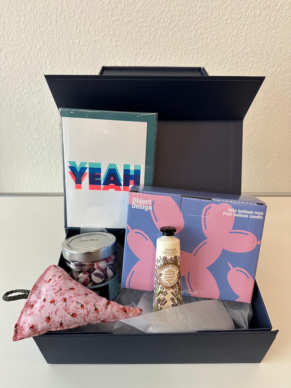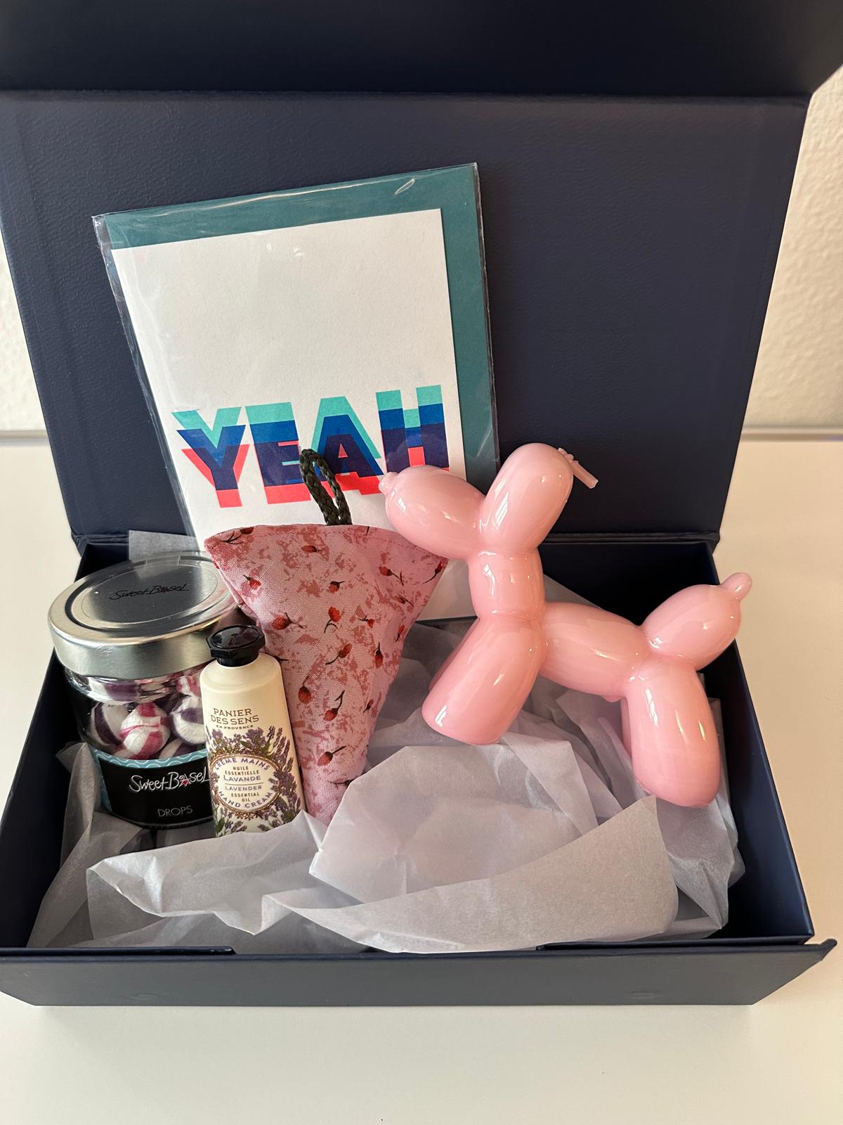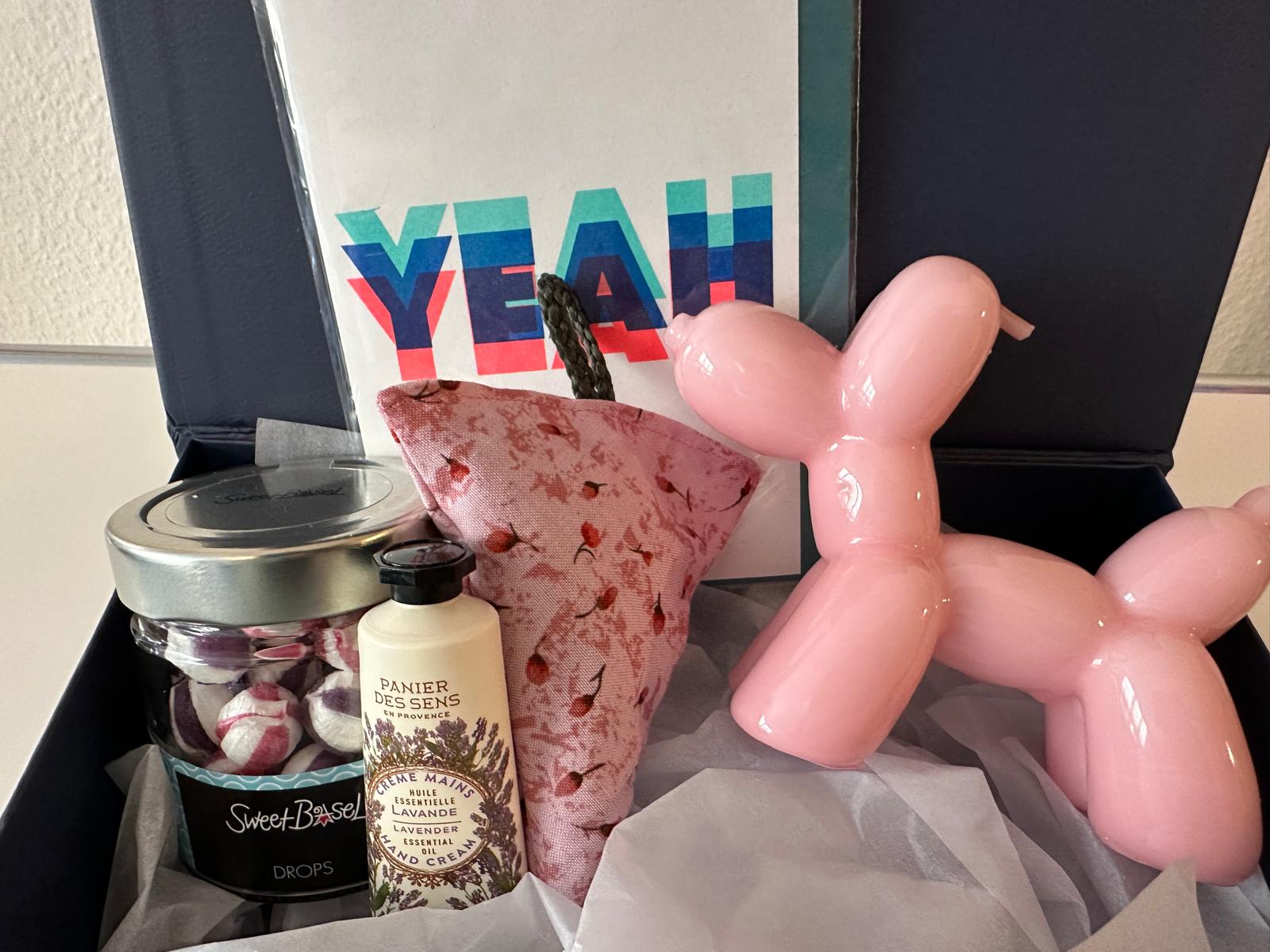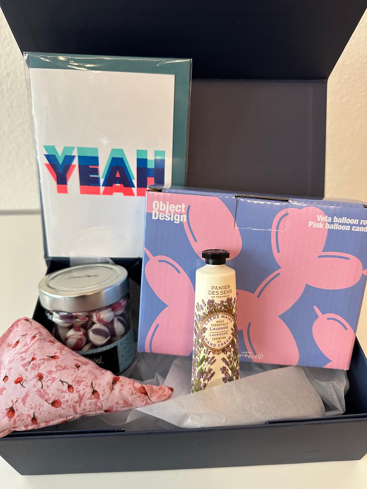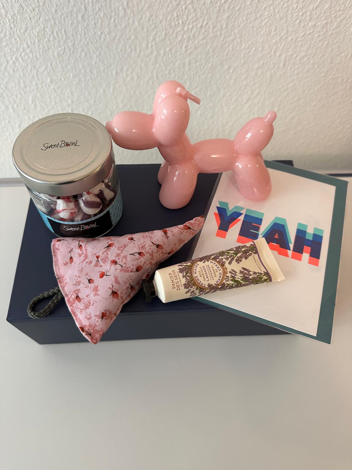 Geschenkbox bestehend aus einer hochwertigen blauen Box, einer Karte von "Pink Stories" inkl. blauem Couvert, einer Deko-Kerze (rosa) in Stil von Jeff Koons' Kunstwerk, Drops von "Sweet Basel" im Glas, einer Handcréme der Marke "Panier des Sens" mit Lavendelgeschmack und einem handgemachten Lavendelsäckli. Die hochwertigen Artikel wurden von den Mitarbeitenden von Adel & Heide ausgewählt und mit Liebe zusammengestellt.
